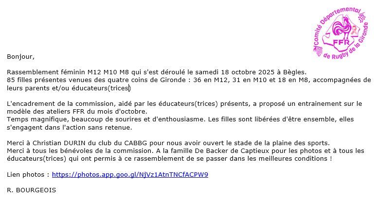 * Samedi 19 octobre 2024 : rassemblement féminin M12-M10-M8 à Bègles Photos
